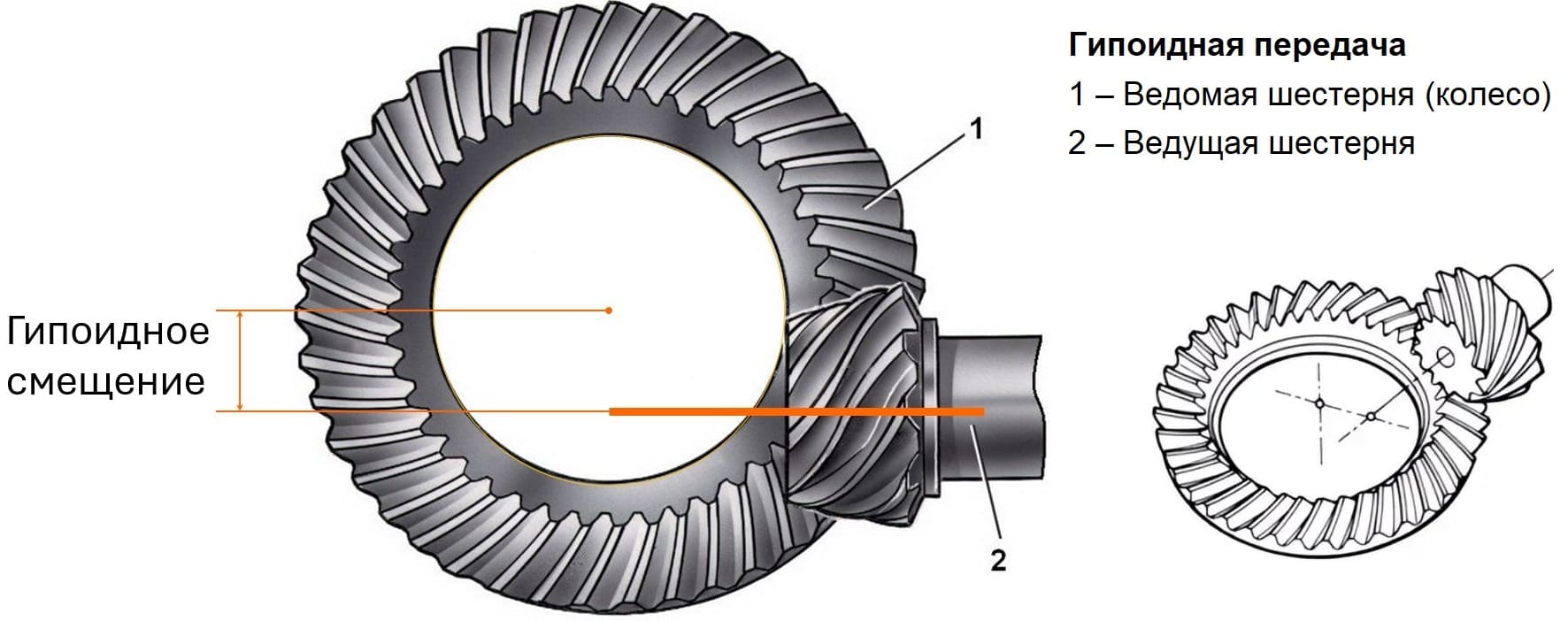 Расстояние между воображаемыми пересечениями осей ведущей шестерни и ведомого колеса. Гипоидная пара работает именно за счёт этого смещения, которое снижает шум и повышает несущую способность. Неправильный выбор смещения приведёт к преждевременному износу. |