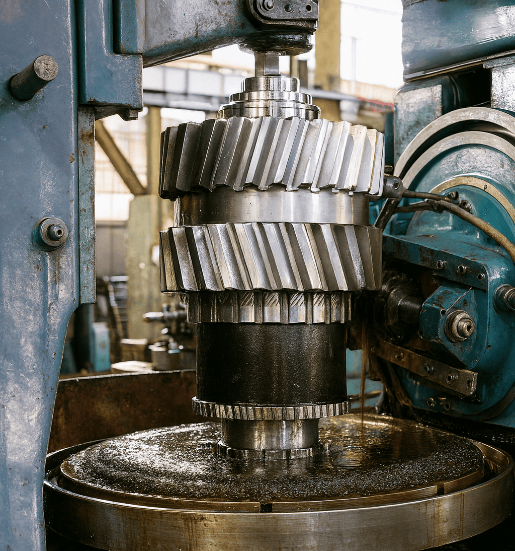 Термообработка обычно включает улучшение (закалку и отпуск) с последующим цементированием или азотированием зубьев, чтобы достичь твёрдости 45–60 HRC при вязкой сердцевине.
