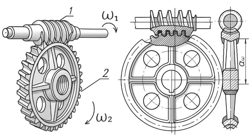 1 – червяк, 2 - червячное колесо, аω– межосевое расстояние, ω1- угловая скорость вращения червяка, ω2- угловая скорость вращения колеса.