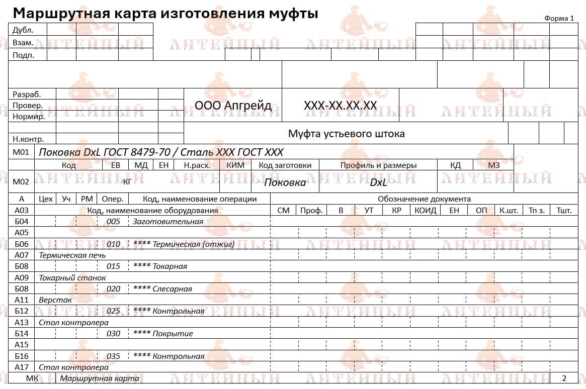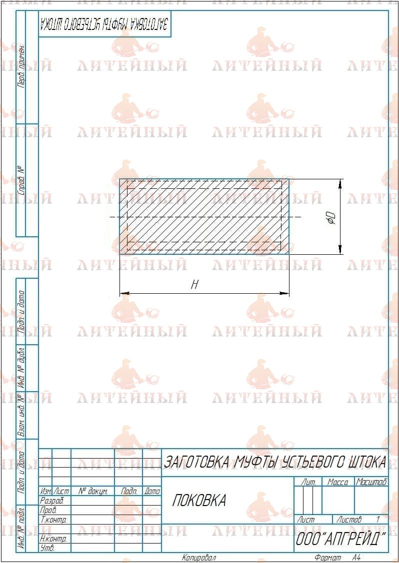 Заготовки для изготовления муфты устьевого штока выполняются из горячекатаных или кованых цилиндрических заготовок с контролем внутренней структуры. На этапе подготовки производится обрезка в размер, токарная правка торцов, центровка и термическая нормализация для снятия остаточных напряжений. Для изделий повышенного класса надежности применяются поковки с ультразвуковым контролем сплошности (по ГОСТ 24507-80).