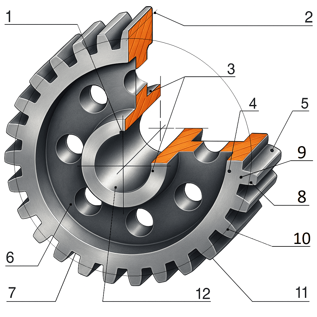 Для ответственных передач применяют легированные конструкционные стали: 18ХГТ, 20ХН3А, 40Х, 20Х2Н4А. Для среднего класса — углеродистые стали 45, 50, 55 с поверхностной закалкой. При работе в условиях коррозии используют нержавеющие стали 12Х18Н10Т, 20Х13. Для малонагруженных механизмов и приборостроения подходят бронзы БрАЖ9-4, БрОФ6, латунь Л63, а также алюминиевые сплавы, обеспечивающие малый вес и тихий ход. Обязательна термообработка — цементация и закалка до 58–62 HRC для поверхностей зубьев с сохранением вязкой сердцевины.