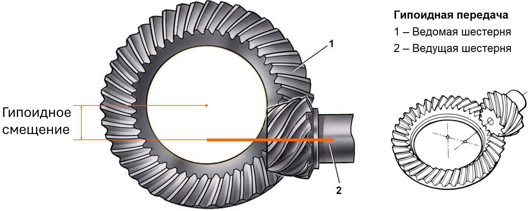 | Смещение осей (е) | Расстояние между воображаемыми пересечениями осей ведущей и ведомой шестерён. Гипоидная пара работает именно за счёт этого смещения, которое снижает шум и повышает несущую способность. Неправильный выбор смещения приведёт к преждевременному износу. |