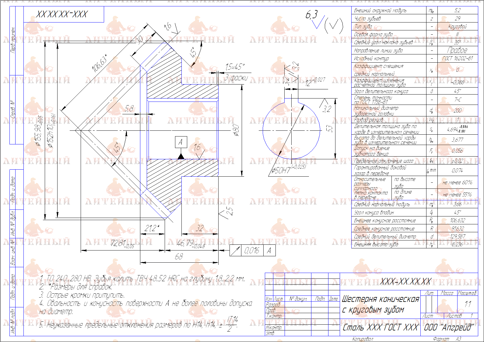 ООО Апгрейд оказывает услуги по изготовлению конических спиральных шестерней любой сложности на заказ по чертежам с учетом всех требований Клиента: