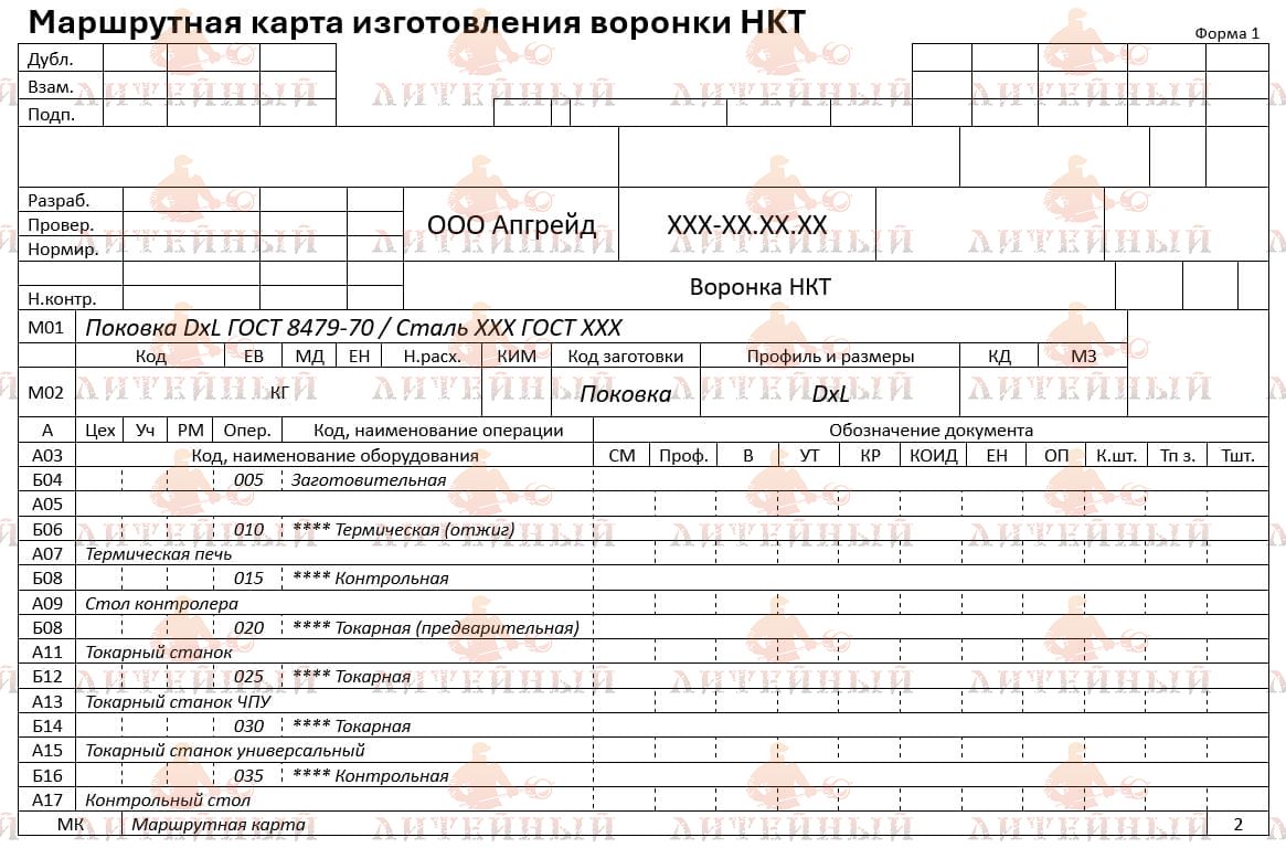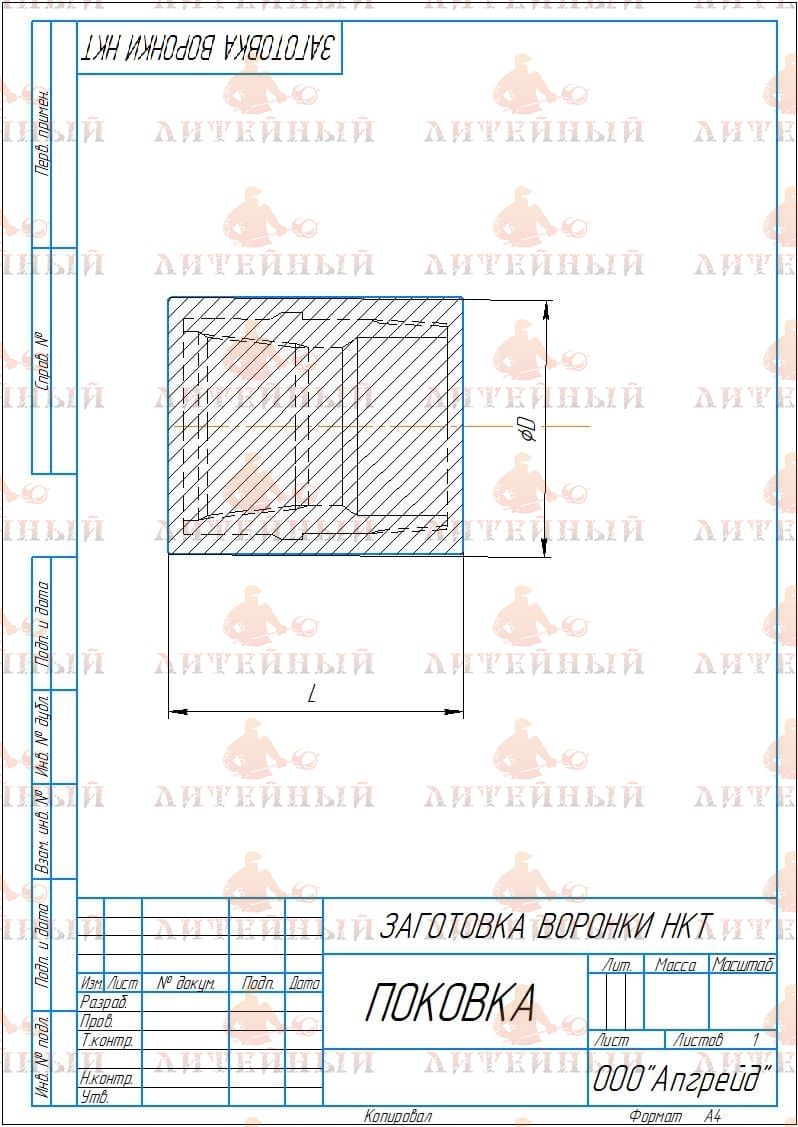 Для производства воронок применяются поковки или горячекатаные заготовки цилиндрической формы. Заготовки проходят осадку и предварительную мехобработку для выведения баз под последующие операции. Контроль выполняется по плотности металла, отсутствию трещин и расслоений. Перед чистовой обработкой заготовки подвергаются нормализации или отжигу для снятия внутренних напряжений.