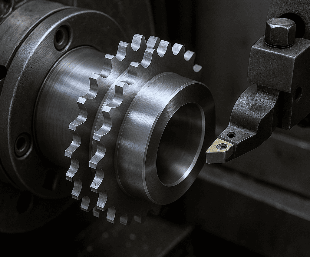 Используется для звездочек малого и среднего размера. Материал обрабатывается на токарных и фрезерных станках. |